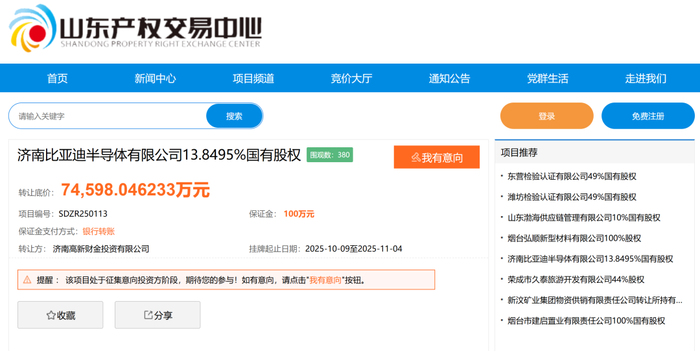 近日,济南高新财金投资有限公司在山东产权交易中心拟挂牌转让济南比亚迪半导体有限公司13.8495%国有股权,转让底价约7.46亿元,挂牌起止时间为10月9日至11月4日。